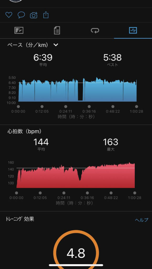 ペースもほぼ均一、最大心拍数も163とさほど上がってないし(いつもは180くらいいくし)。