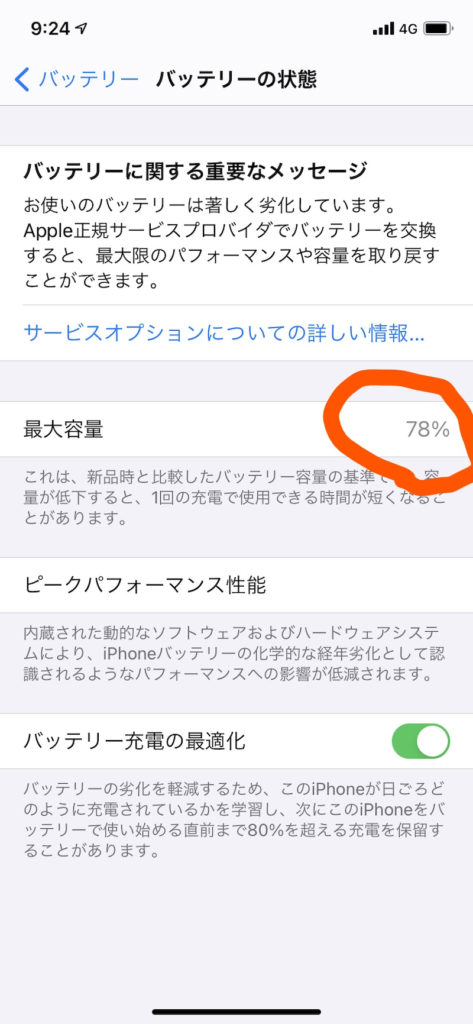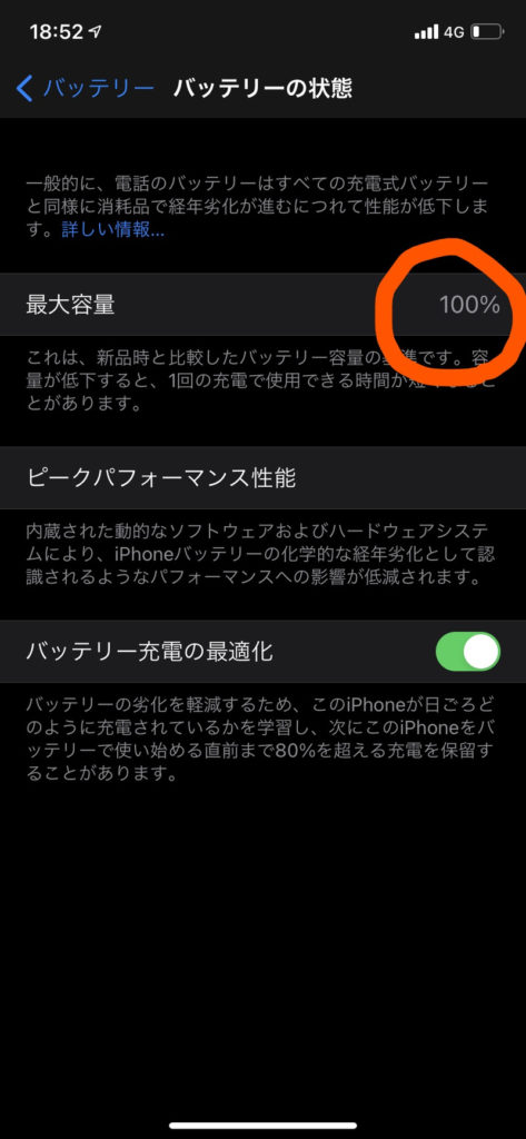 保持容量って何ですか?って感じですが、要するに見た目満タン充電されても、バッテリーの劣化とかによって本当の充電100%にはならなくなっていくってことなんでしょうね。