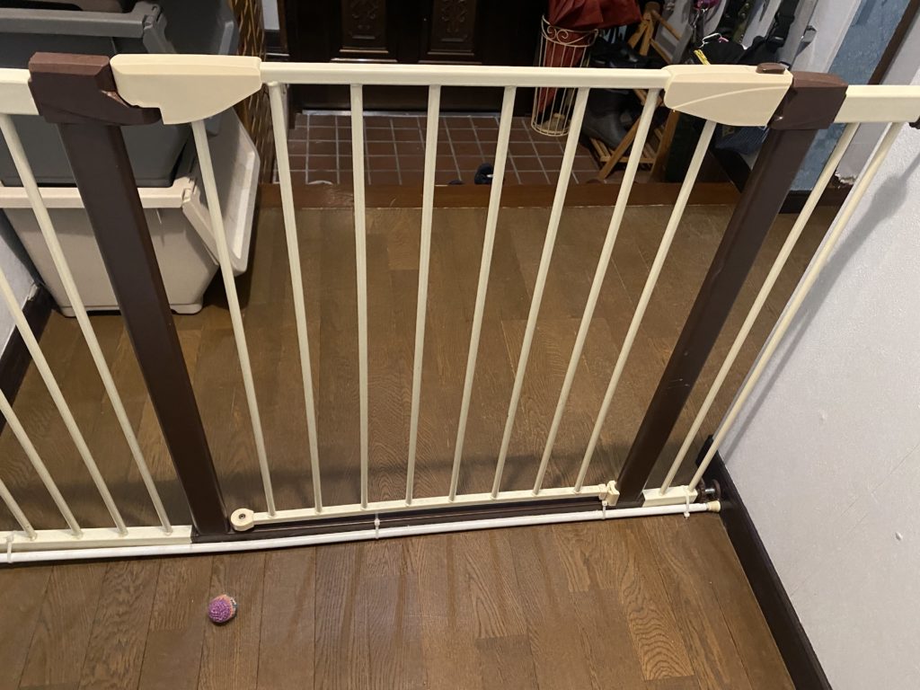 またもやベビーゲートの話。うちには犬の脱走対策用にもうひとつベビーゲートがついています。玄関とリビングの間です。ここは120cmほどの幅がありベビーゲート本体だけでは足りないため、10cmと30cmの拡張フレームを両側に追加して設置しています。