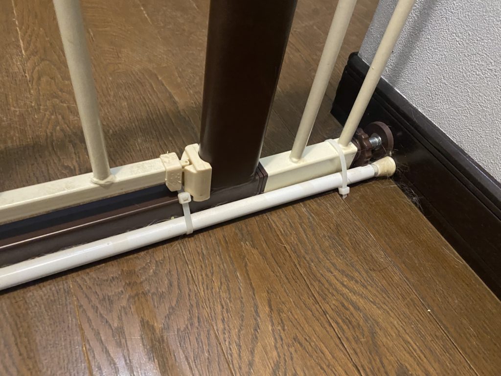 で、思いついてやってみたことです。ベビーゲートと拡張フレームを足した長さになるような細い突っ張り棒を100均等で購入する。200円くらいだったと思います。ちょうどよい長さの棒があるなら無理に突っ張り棒でなくても構いません。それと結束バンドを用意。ベビーゲートの一番下側に突っ張り棒を這わせ結束バンドで結んでいきます。
