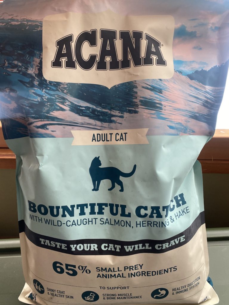 で、試してみたのが「アカナクラシックホームステッドハーベスト」というフード。カナダのメーカーでフード中の肉類の割合が高いとのこと。たしかに、すんごく肉の匂いがします。食いつきはというと、バックバク食べます。気に入ったみたい。