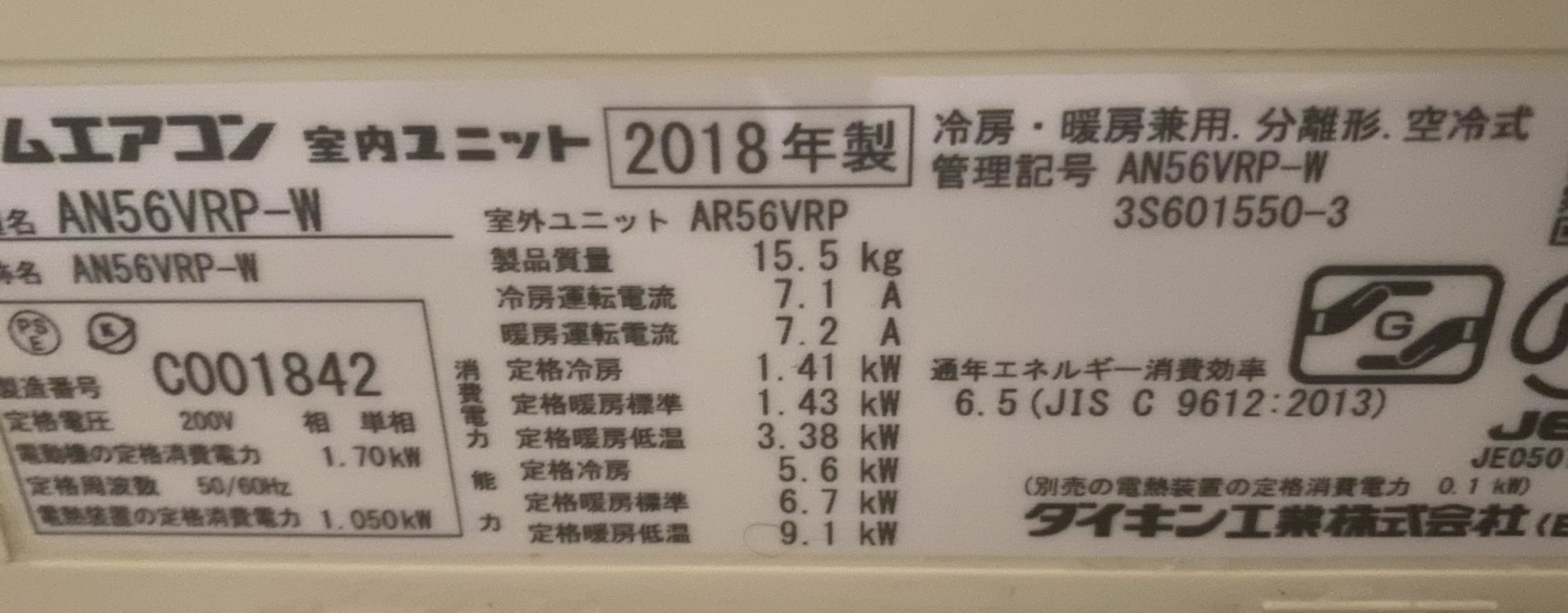 2018年に購入したリビングのエアコン。ダイキンのAN56VRP-Wという機種で単相200Vのお掃除機能がついた加湿暖房ができるタイプのもの。単相200Vなので力も強く冷暖房能力には申し分ありません。18畳用なのに20畳以上カバーしてくれています。