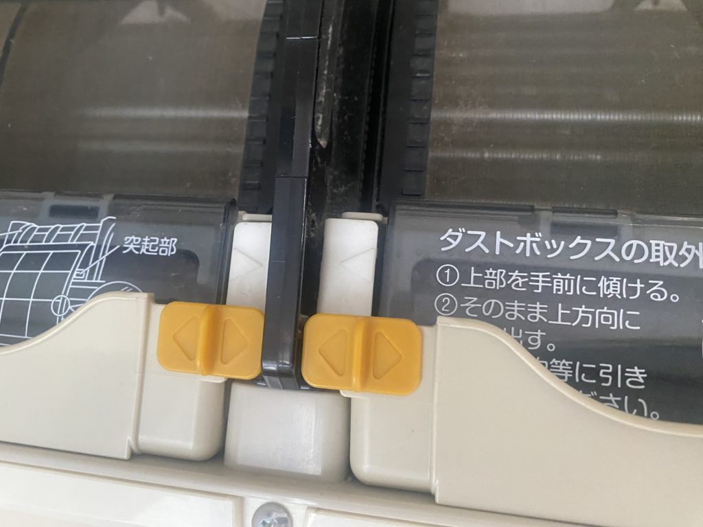バキッという音とともにダストボックスの受け(黄色い耳の付いたやつ)が落っこち、ダストボックスを真上に引き上げてもなかなかとれず、お掃除レーンを移動するだけとか。やっとのことで取り外して掃除して、いざ取り付けとなってもカチッと音がするわけでもないので、どこまで押し込めばよいのかもわからず。毎回適当にやってたわけです。
