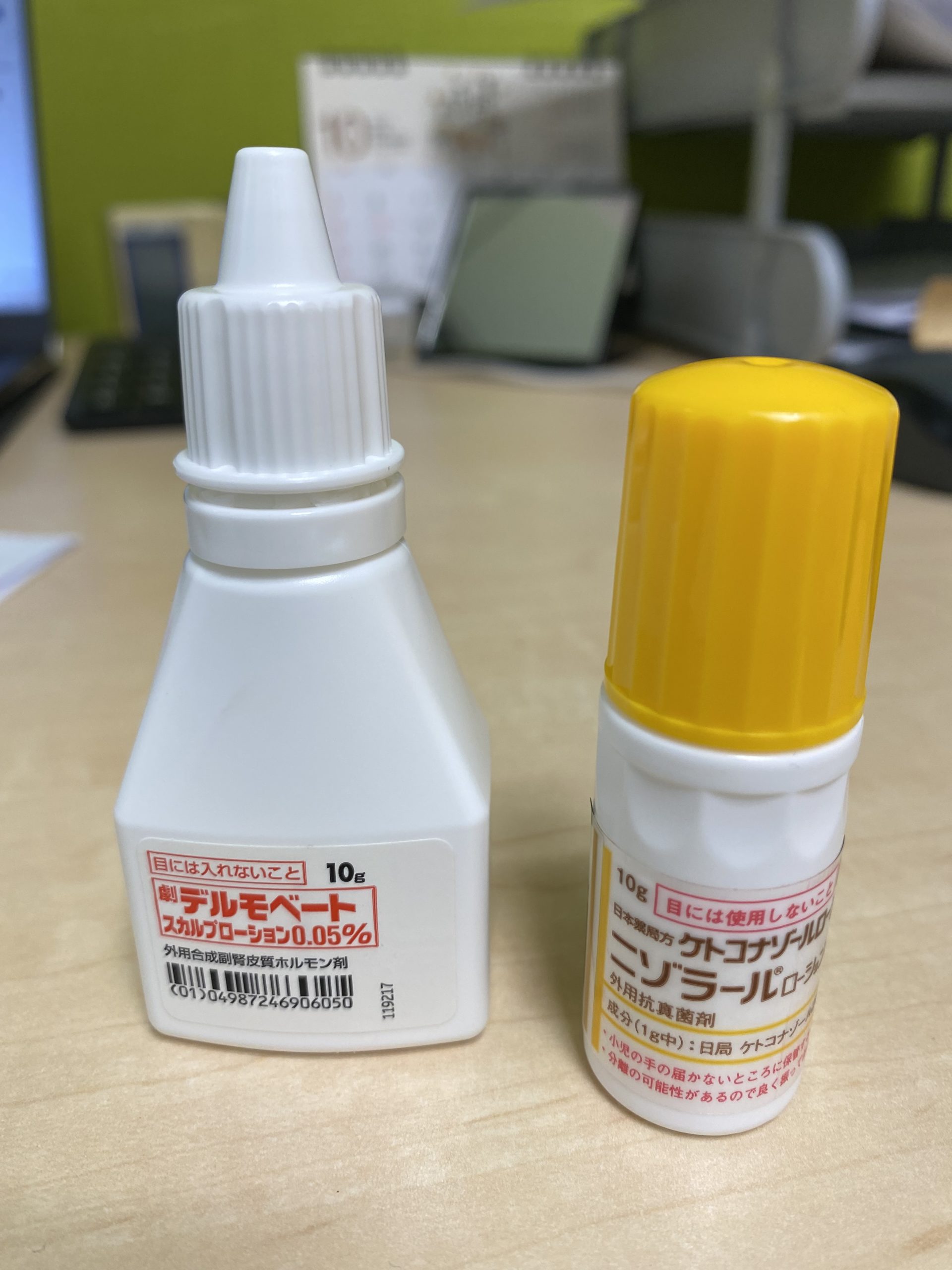 次は頭。「ケトコナゾールローション2%」はそのままに、「ベタメタゾン酪酸エステルプロピオン酸エステルローション0.05%」をやめて「デルモベートスカルプローション0.05%」に変更。これ、なんかすごいです。塗った瞬間に頭皮が燃えるようにヒリヒリ。ハゲるかと思いましたが大丈夫でした。この組み合わせはすごく効いています。処方してもらってまだ5日ですが、もうフケらしきものはあまり出なくなってます。